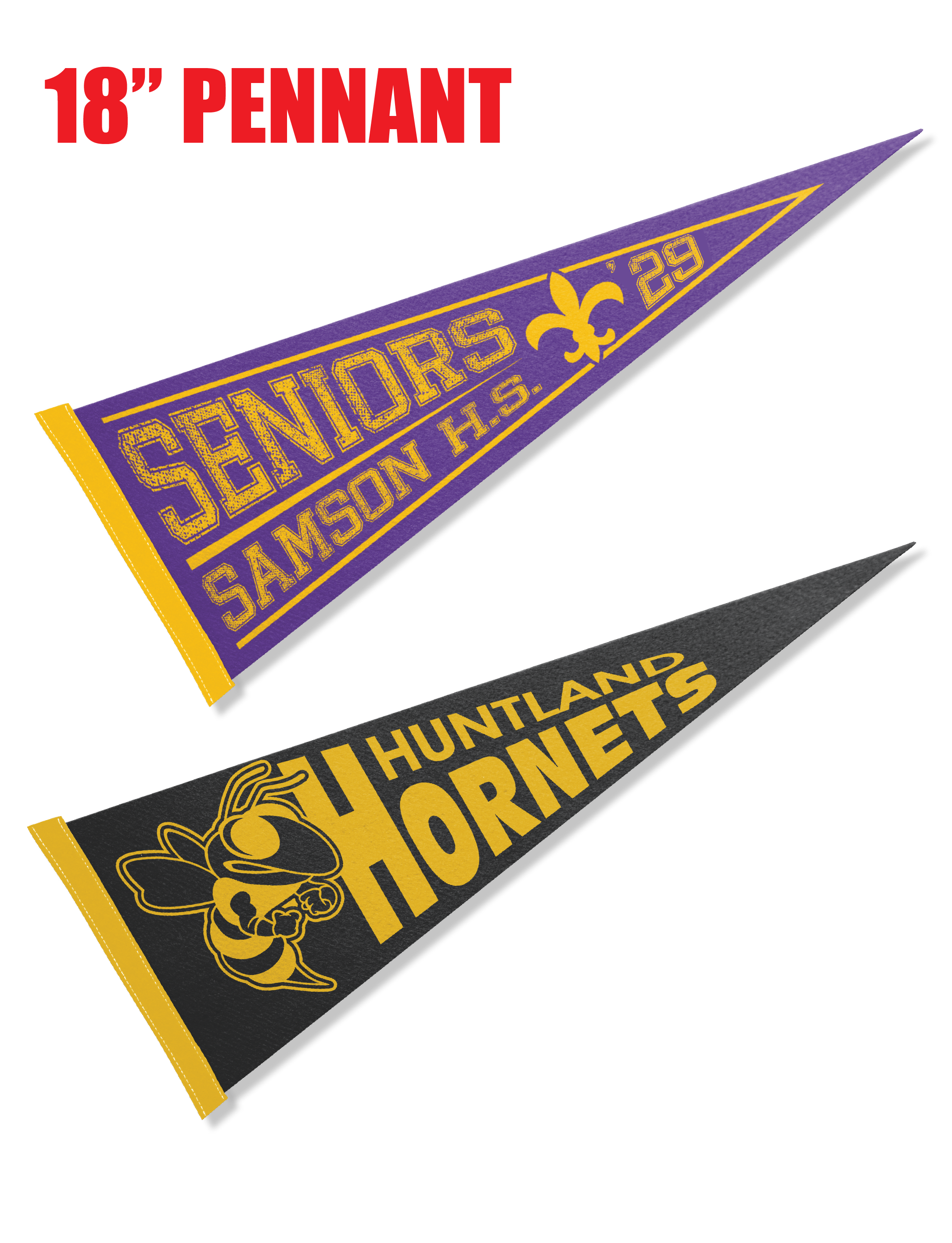 You can custom design them the way you want them to look. We offer three different sizes for the classic pennant and photo pennant 5″x 12″, 8″ x 18″, 9″ x 24″. Go way back with us by ordering your Pennants today. Create it, Design it, Wave them in the air like you just don’t care!! You pick the color, You pick phrase, You pick the mascot, and We’ll do the rest! These classic’s are fabulous for fundraising. Pennants are made of a top quality synthetic felt and have a sewn on felt stripe. Prices include a one-color print with your choice of design. (For your custom drawn design, please fax or call in your order.) Pennants are shipped 5 weeks after the receipt of your order.