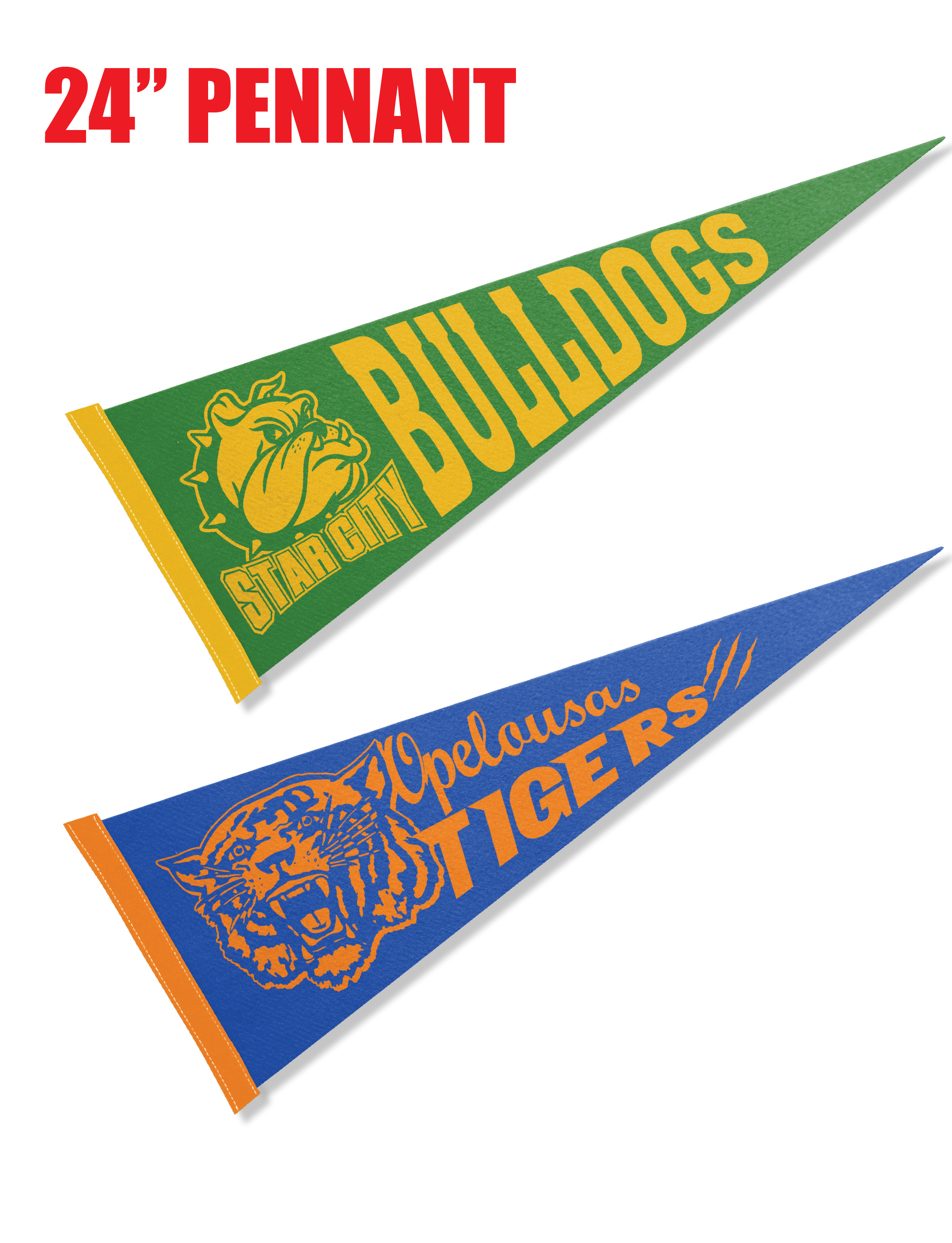 This Large 9″ x 24″ Pennant is wonderful for showing off your spirit and adding excitement in the air!!! We offer three different sizes for the classic pennant and photo pennant 5″x 12″, 8″ x 18″, 9″ x 24″. Go way back with us by ordering your Pennants today. You pick the color, You pick the phrase, You pick the mascot, and We’ll do the rest! These classics are fabulous for fundraising. Pennants are made of a top quality synthetic felt and have a sewn on felt stripe. Prices include a one-color print with your choice of design. (For your custom drawn design, please fax or call in your order.) Pennants are shipped 5 weeks after the receipt of your order. Production times do not include Saturday, Sunday, or Holidays. Pennant sticks are sold separately, see item PS-36. Add a photo cut to any pennant for an additional .10 cents each.