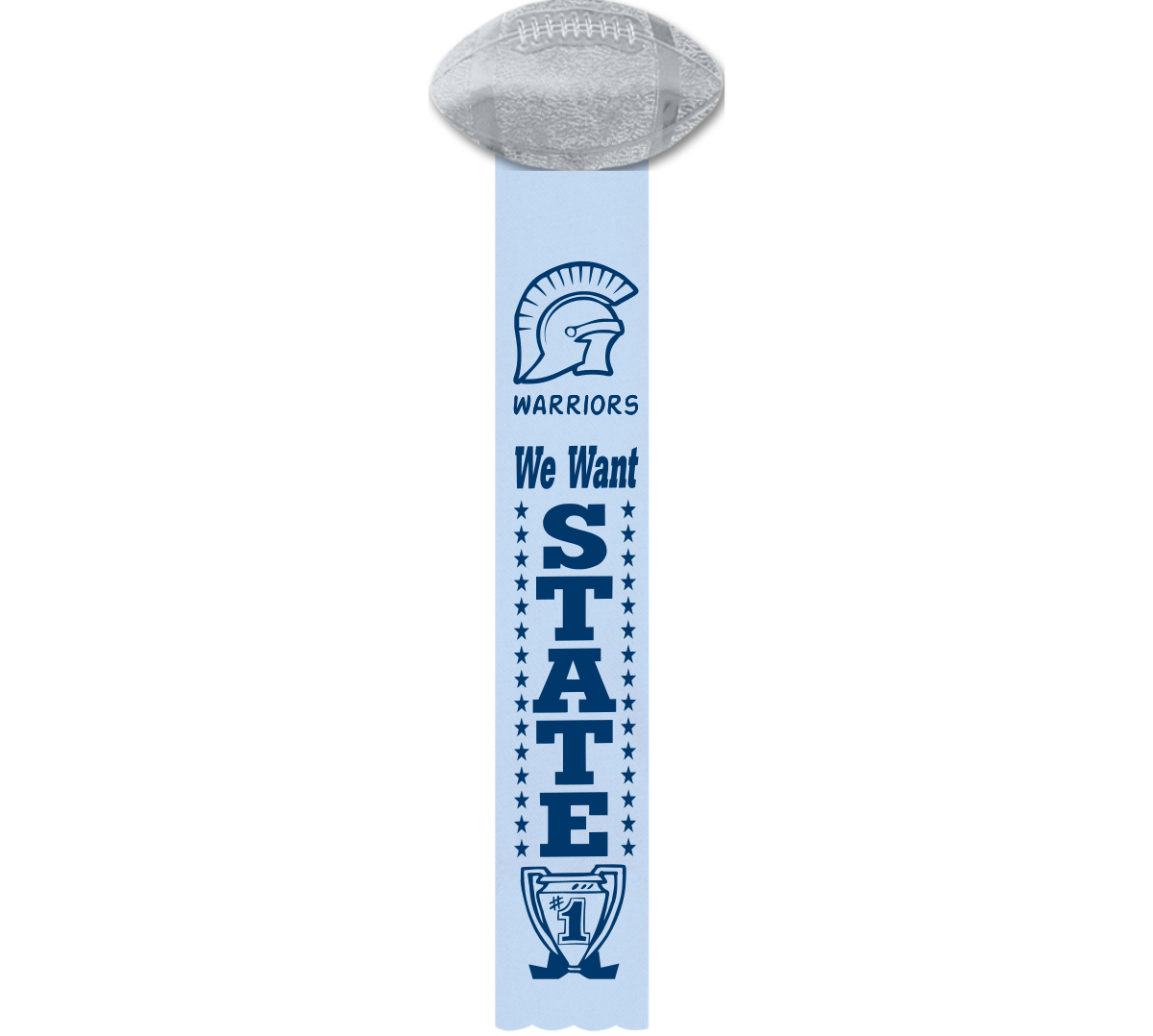 With these ribbons, if you need sticky tops, we have multiple options available in gold or silver tops! All of our options are available at a very reasonable price. We also have the super badge available at a great price! It’s simple when it comes to ordering these ribbons. Simply choose your ribbon color, your imprint color, your team nickname, a mascot, and then one of our yell designs. The stock fight yells cannot be altered. For custom ribbons and pricing, please fax or phone in your order.